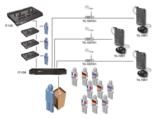 It is possible to cascade up to 11 interpretation consoles via a 25-pole D-sub cable. Each console is supplied with a 3 m cable as standard equipment. The IT-12D supports two channels. Only one of which is active at a time, the other serves as a standby channel which can be selected if required. The desired interpretation channels can be stored permanently at the console. The last active channel will be stored after switching off the operating voltage and will be available again immediately after switching on the unit. The active channel allows for two simultaneous interpreters/commentators to use the IT-12D at the same time.