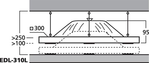 Dimensions: 300mm x 300mm, required clearance above the ceiling when resting the speaker directly on the grid:> 10cm, when suspending it above the ceiling:> 25cm