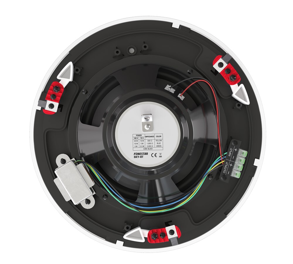 Den innovativa SKY-serien av takhögtalare är full av detaljer som gör dem speciella. Noggrant skräddarsydd för att återge det bästa ljudet och möta behoven hos ljudinstallationer. Vi har skapat SKY-serien av takhögtalare för att erbjuda en unik lösning. Vi tillhandahåller förbättringar i installationen, ett definierat ljud för bakgrundsmusik och ljudförstärkning. Vi har noggrant valt ut material och komponenter för att få bästa prestanda och tillförlitlighet, med ett fantastiskt ljud. Avrundar vår idé om den bästa takhögtalaren. Gallret är den enda synliga delen av högtalaren när den väl har installerats i taket, så vi har designat den för att ha minimal visuell påverkan, ramlös och låg profil. Den är byggd i aluminium med hög resistans flytande färg. Inga rostfläckar kommer att uppstå och den kommer att behålla sitt ursprungliga utseende. Den kan anpassas genom att ta bort den avtagbara logotypen och den kan målas. Anslutningen av kablarna görs med innovativa snabbkopplingsterminaler, som erbjuder en omedelbar anslutning med ett säkert förankringssystem och maximal ledningsförmåga. Takhögtalaren har ett antifallsystem för att underlätta installationen, vilket gör att högtalaren kan placeras innan den slutliga installationen med takfästena. Dessutom har den en krok för högtalarfäste och en säkerhetskabel. Den har ett mycket stabilt takfästesystem med tre fästen och ett skruvjusteringssystem. Installationen är snabb och enkel och ger ett stadigt och säkert grepp. Huvudkomponenten för ljuduppspelning är högtalaren, med ett kraftigt polypropenmembran och en dubbel kon, vilket förbättrar frekvensresponsen och högfrekvent spridning. När den väl har installerats har högtalaren ett IP-44 skydd mot damm och vatten. Stänk påverkar inte högtalarens prestanda.