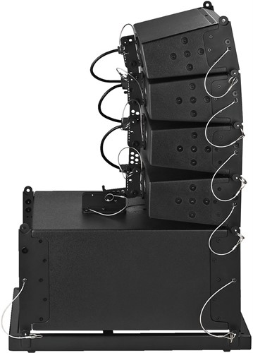 An array of high power capability and of compact size with 4 mid-high range speaker units and a dual bass module, each section with its own 350WRMS power amplifier and controlling software (the configuration of the system is supported by a PC, but it operates as a stand-alone unit!). Supplied with extensive and variable equipment for hanging the system up in a suspending (flying) way, clusters with up to 4 x L-RAY/1000 are possible. The mid-high range systems are each equipped with 2 x 10cm (4") high-performance speakers and a magnetostatic speaker for a perfect reproduction rich in detail. The dynamic characteristics are absolutely convincing, at the same time the tonality at the basic setting is very pleasant. Despite its compact size, the low frequency response and level stability of the bass module with two 20cm (8") bass speakers are amazing which is only possible by using special bass speakers of very high power capability and the extensive optimisation of the DSP.
