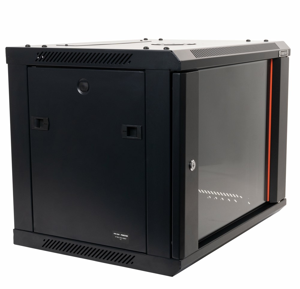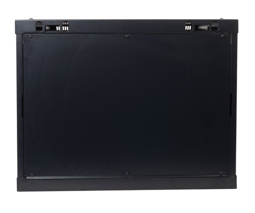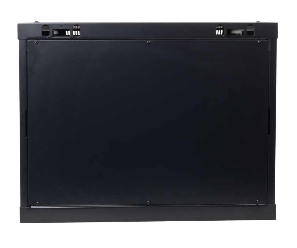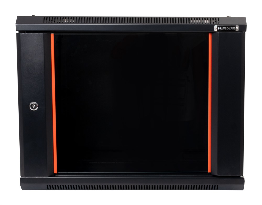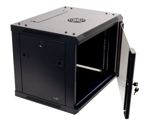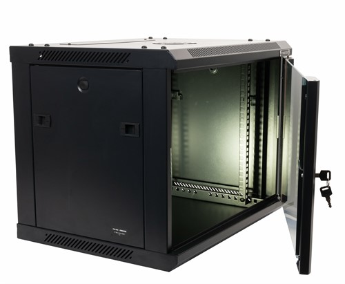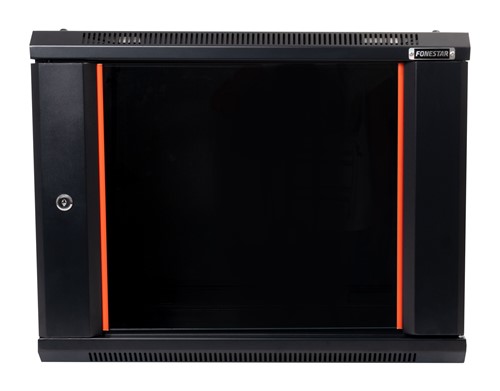 19" väggmonterat rackskåp Frontöppning med lås och nyckel. Gjord av stål. Svart emalj finish. |