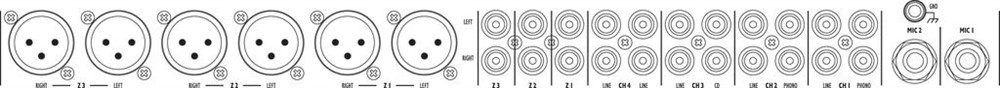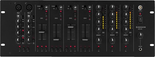 Zone outputs, each with 3-way equalizer, LED level display of the stereo master, balance control, pre-fader listening (PFL) and mono/stereo selector switch