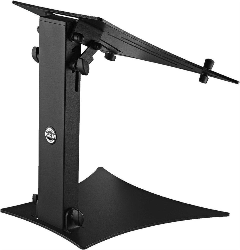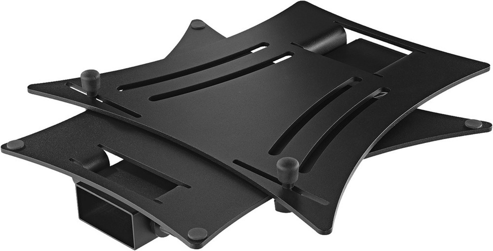 Individually adjustable stop pins with rubber caps for mounting standard types of laptops or mixers, CD players