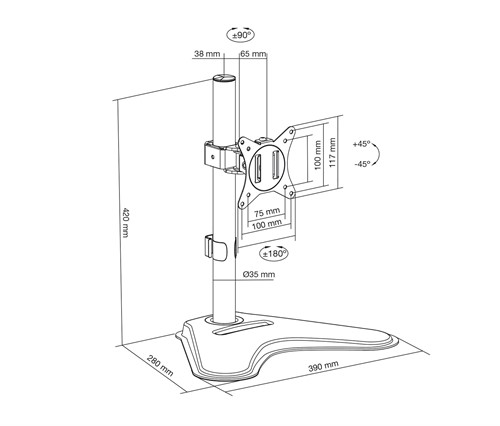 VESA tallrik: 11,7 x 11,7 cm Stativ: 39 x 2,5 x 28 cm Rör: 39,6 cm x 3,5 cm Ø Höjdjusterbar upp till 36,1 cm (mitten av VESA-plattan) |
