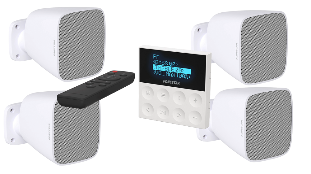Här kommer en komplett ljudlösning (allt-i-ett) som inkluderar två par vägghögtalare och en väggmonterad förstärkare. Detta system erbjuder flera uppspelningsalternativ, såsom Bluetooth®, USB, FM-radio med 50 förinställda kanaler och två aux-ingångar, vilket ger dig möjlighet att spela musik från i princip vilken enhet som helst med linjeutgång.