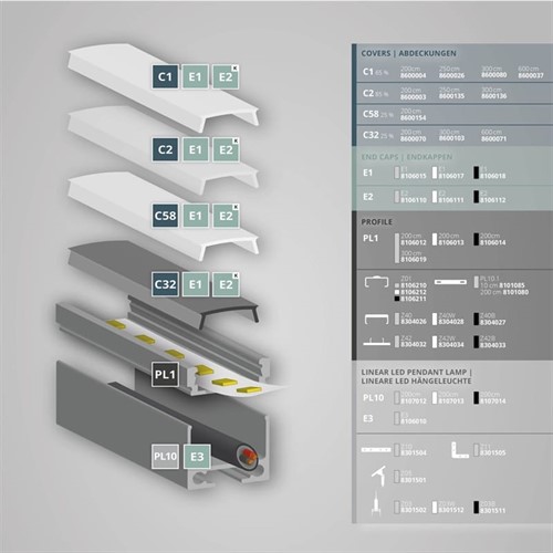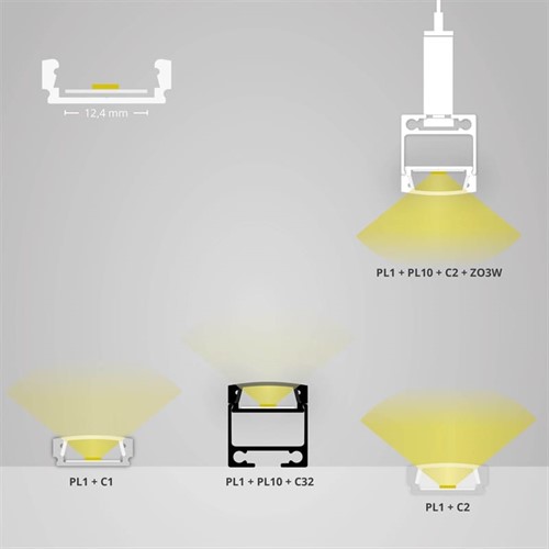 PL1 LED-profilen har en standardlängd på 200 cm och är lämplig för LED-remsor med en maximal bredd på 12 mm. Profilen har en särskilt smal och platt design och är lätt att montera på väggar, tak eller möbler. Dessutom kan denna profil även användas som pendel, förutsatt att du använder rätt kabelupphängning.