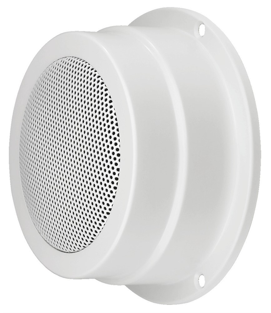 White plastic cabinet (surface-mount version with open rear panel) with protective metal grille