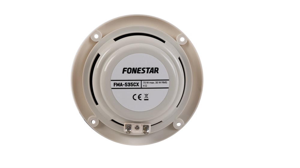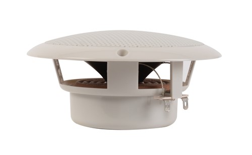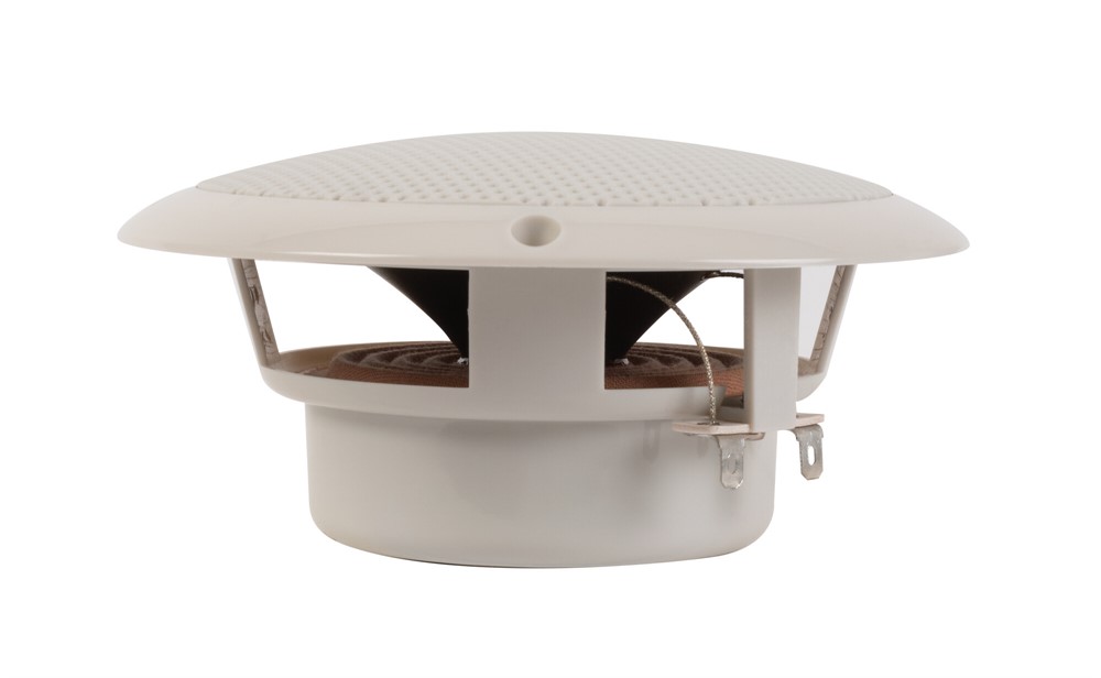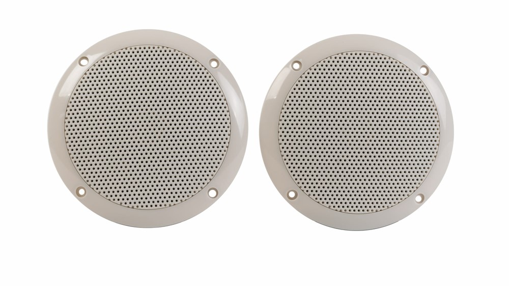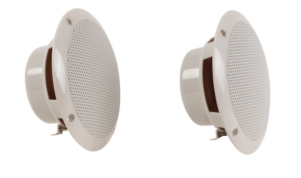 Högtalarpar för marina miljöer, med vitt chassi och galler samt koner av polypropen.