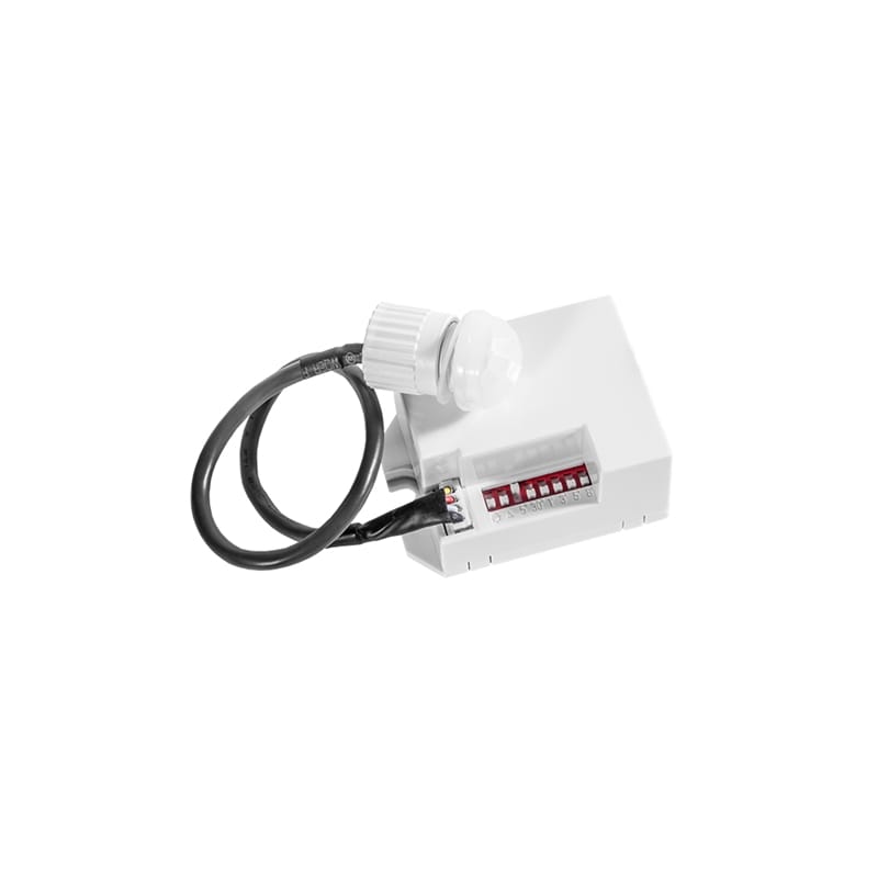 Fungerar på 230 V och tänder/aktiverar alternativ släcker/stänger av belysningen eller musikspelare automatiskt baserat på rörelse och ljusnivå.