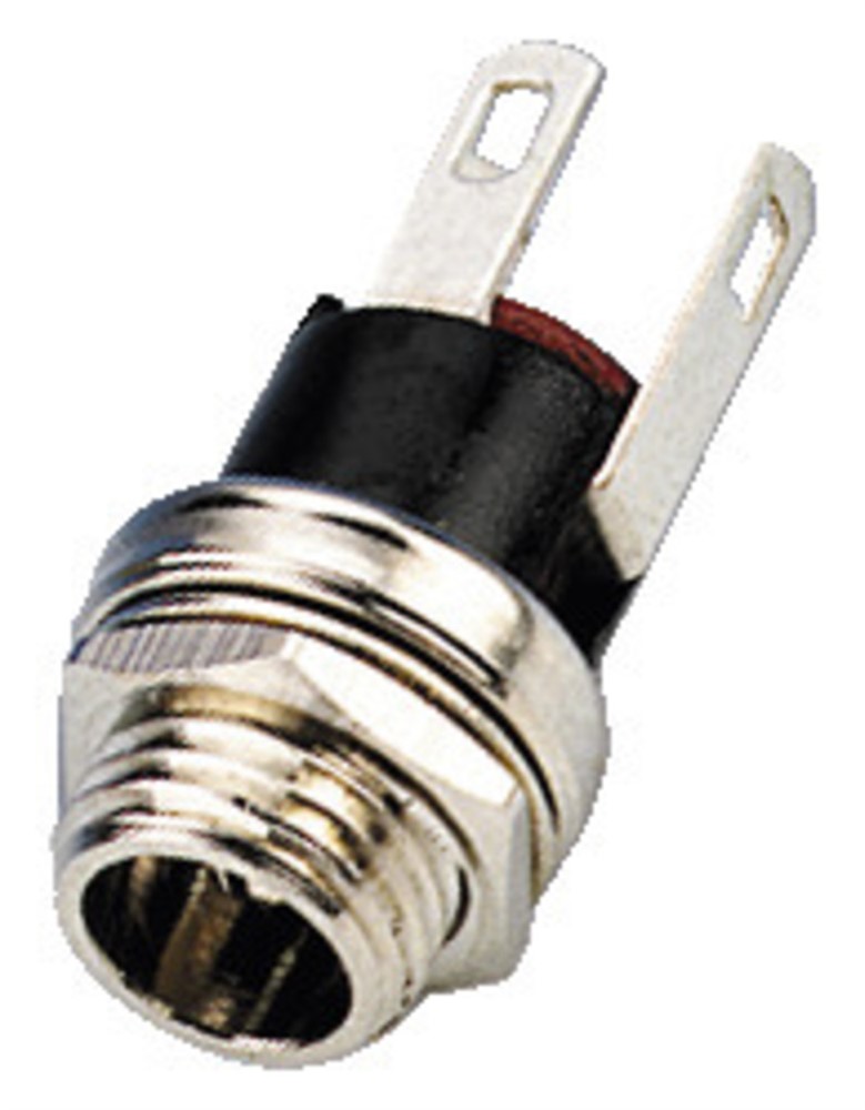 Low-voltage panel jack, with central fixing for 8 mm drill hole. With switching contact, length: 21 mm.