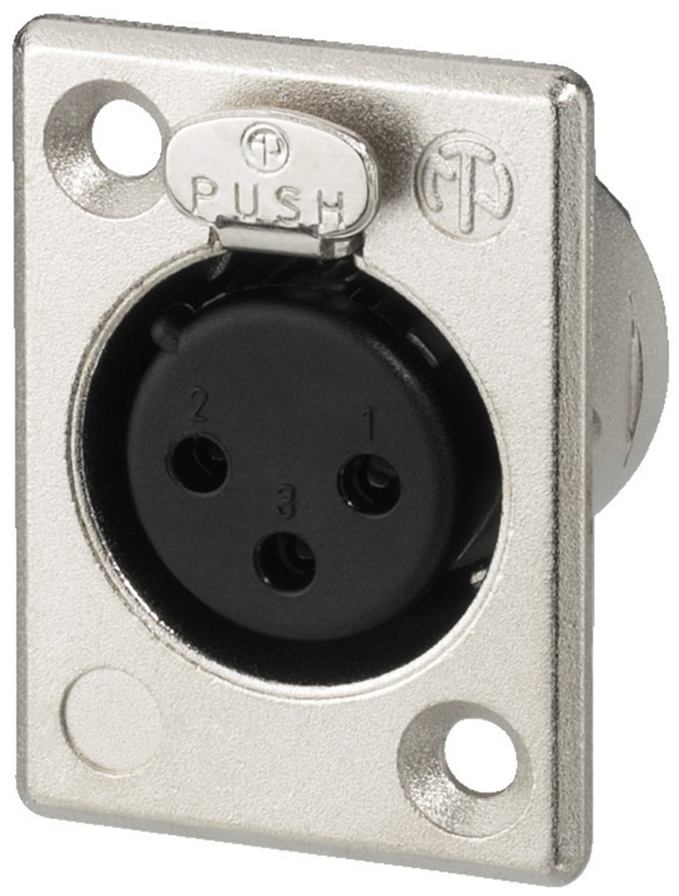 NEUTRIK XLR panel connectors, 3 poles, with nickel-plated contacts, solder lugs, P series standard.