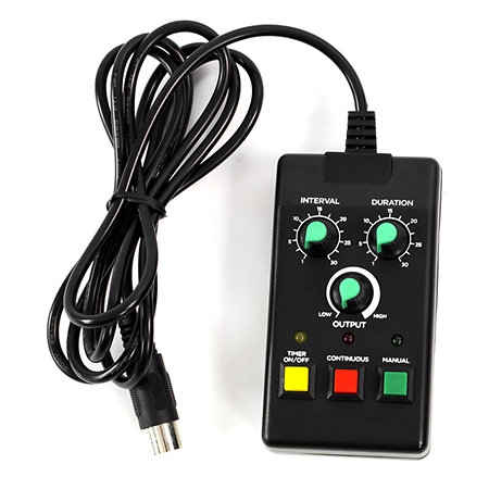 Denna dimmaskin är utrustad med ett värmeelement på 1000W och har en trådbunden fjärrkontroll för att justera flödet och fläktens kraft på distans.