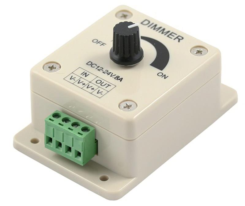 Det enklaste sättet att dimmra för 12 eller 24V LED. Används mellan strömförsörjningen och LED armaturen. Klarar upp till 8 Amp. Om man vill så är enheten lätt att ta isär för tex montering i väggdosa. Enkel att koppla via skruvplintar, IP20 d.v.s för inomhus bruk