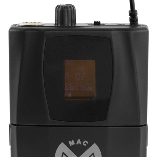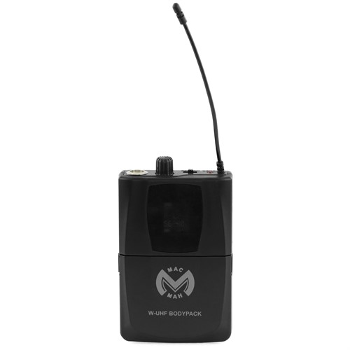 Bodypack-sändare med huvudburen mikrofon är en kompakt sändare som använder DQPSK-modulering. Den kan användas när den är ihopkopplad med en Mac Mah W-UHF 100 eller 200 M-mottagare (säljs separat) för att fånga ljud för intervjuer, TV-sändningar, nyhetsrapporter (ENG) och andra program som sänder och ljudinspelningar. Med 16 kanaler uppdelade i två grupper, en lättläst LCD-skärm, en räckvidd på över 50 meter, en mute-funktion och en 3,5 mm mini-Jack mikrofoningång, l Mac Mah ficksändare har en RF-effekt på 30mW