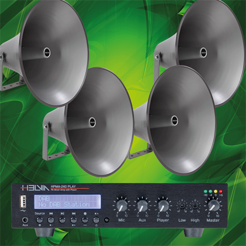 Förstärkaren i paketet är HPMA-240 Play, en kompakt och driftsäker mixerförstärkare på 240 W med inbyggd mediaspelare.