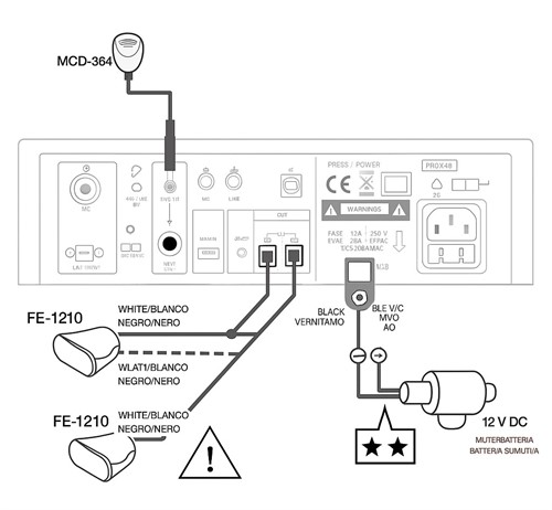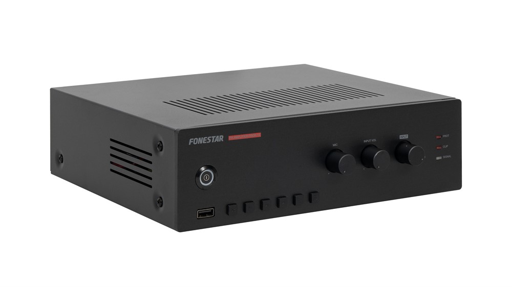 • PROX-15 PA-förstärkare: Denna förstärkare levererar 15 W RMS och är utrustad med en inbyggd USB/FM-spelare. Den har en mikrofoningång med mixningsfunktion, gain- och prioritetskontroll samt tonkontroller för optimal ljudanpassning.