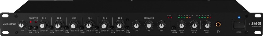 - 6 stereolinjeingångar, 6 balanserade mono mikrofoningångar, omkopplingsbara.