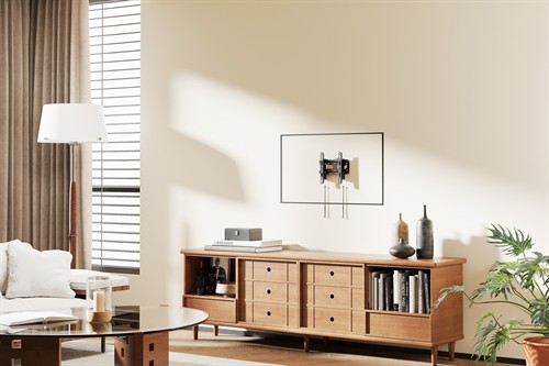 TILT-022BA är ett lutbart väggfäste för TV-apparater från 23 tum till 55 tum (58,4 till 139,7 cm), utformat för att säkerställa stabilitet och användarvänlighet. Dess kompakta och robusta struktur gör att skärmen kan lutas vertikalt upp till ±12°, vilket optimerar betraktningsvinkeln och förbättrar användarupplevelsen. Med en svart finish och ett avstånd på 5,3 cm från väggen smälter den diskret in i alla miljöer.