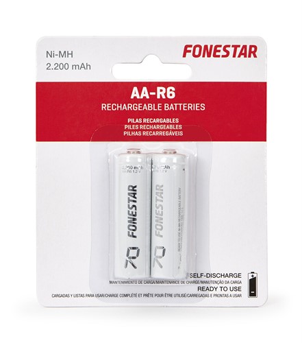 Blisterförpackning med 2 uppladdningsbara Ni-MH AA-R6 2200mAh-batterier.