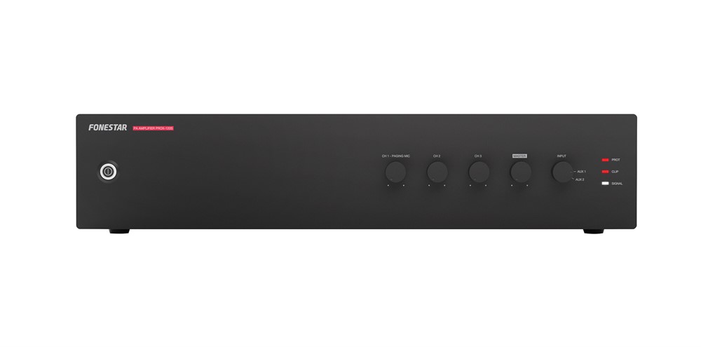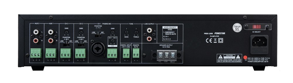 Mikrofoningångar med mix, gain och prioritetsnivåkontroll. Tonkontroll. 100V och 4Ω utgång |