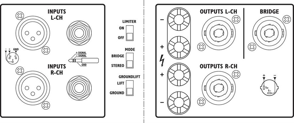 | Connections | 1 x 3-pole XLR L/R, bal. 1 x 6.3 mm jack L/R, bal. 3 x SPEAKER 2 x pair of screw terminals |